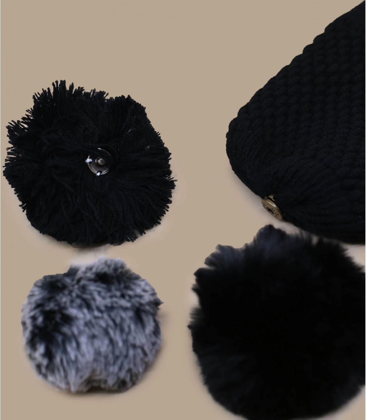 Schützen Sie sich vor der Kälte mit einer eleganten und praktischen Mütze. Tragen Sie diese elegante schwarze Bommelmütze, die komplett mit Fleece gefüttert ist. Sie wird mit austauschbaren Bommeln aus Kaninchenfell Imitat geliefert.