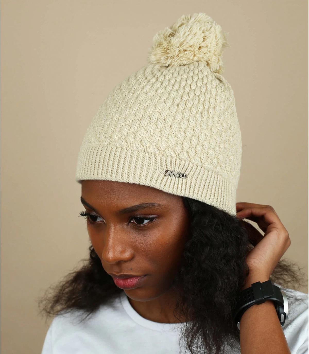 Die beigefarbene Mütze von Môle mit ihren austauschbaren Bommeln, die Kaninchenfell imitieren, ist sehr schick und dank des vollständigen Fleece-Futters auch sehr bequem.