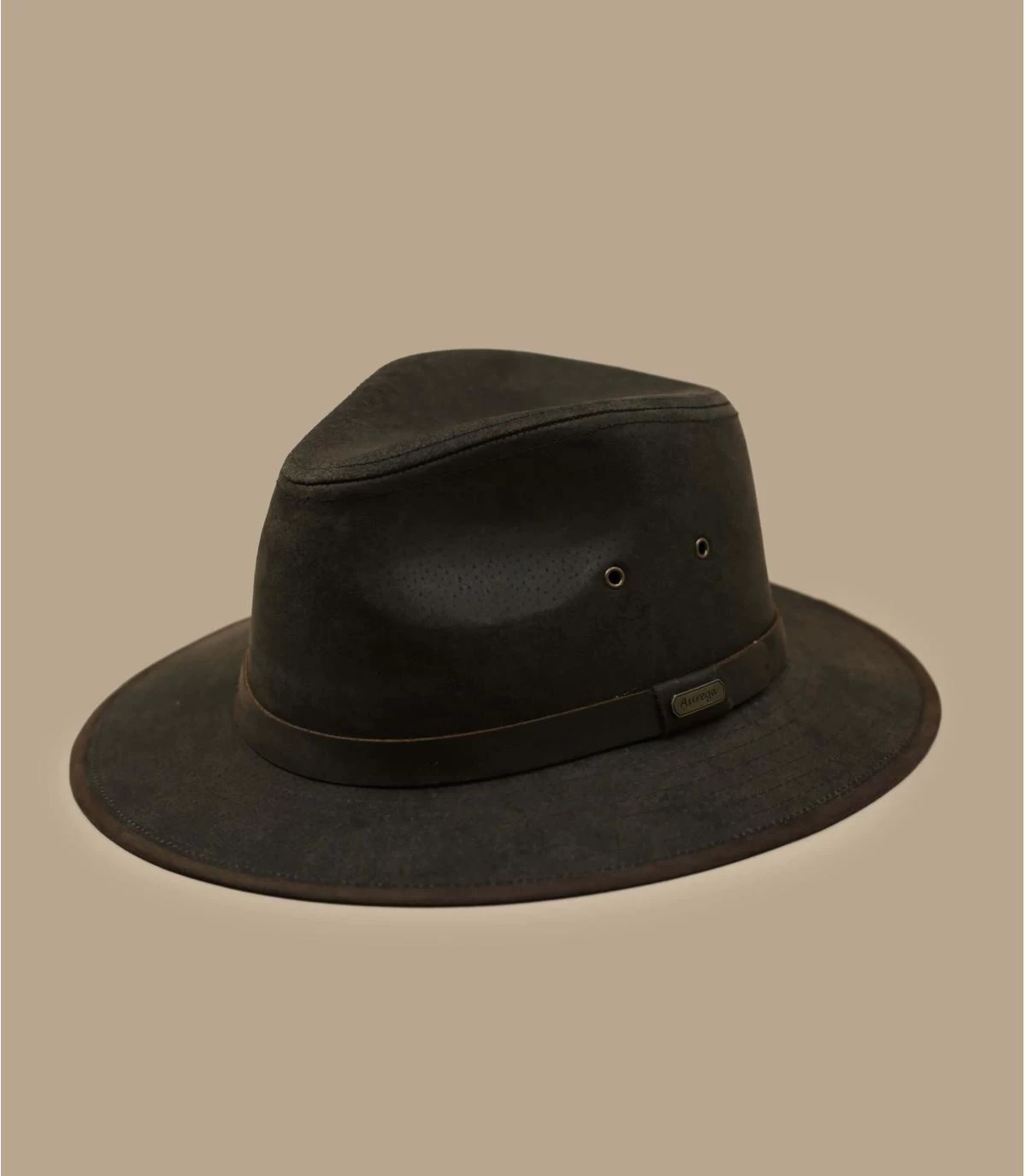 Sie werden die rustikale und authentische Art dieses Fedora-Hutes aus altem Leder zu schätzen wissen, der Ihnen den Look eines australischen Jägers verleiht! Er ist mit einem Lederriemen entlang der Kopfkrone verziert und zwei Ösen regeln die Luftzirkulation.