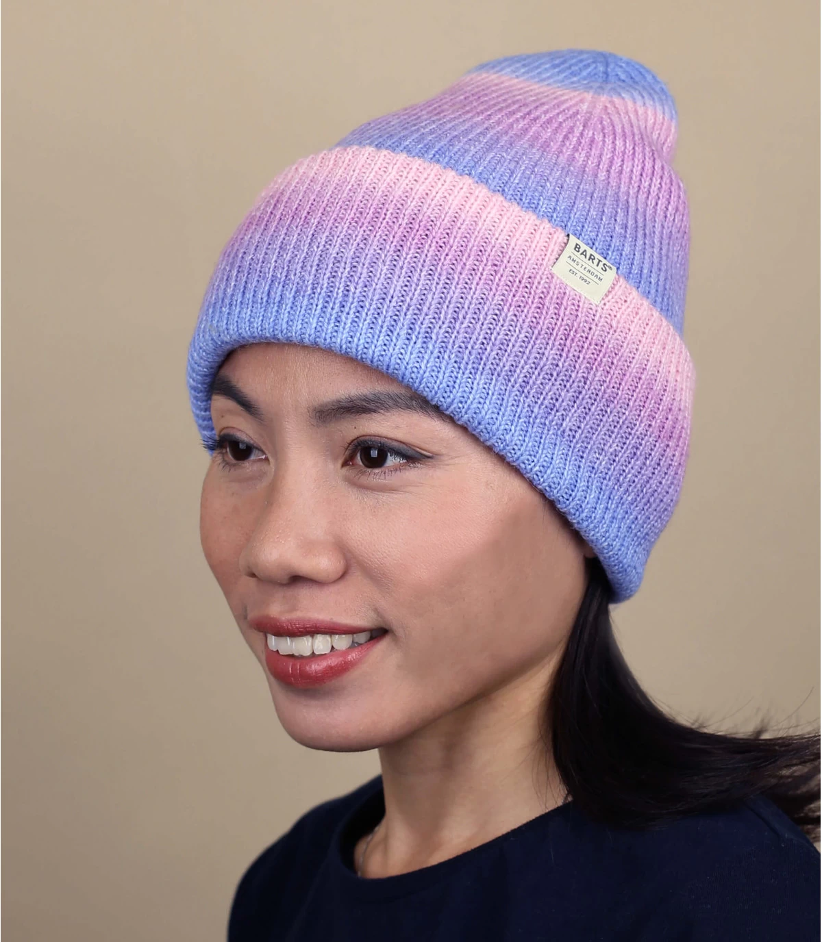 Mit dieser rosafarbenen Mütze mit lilafarbenem Farbverlauf werden Sie garantiert auffallen. Man trägt die grob gestrickten Maschen gerne und ihr kindliches Aussehen ist herzerwärmend, wenn es im Herbst oder Winter kalt ist.