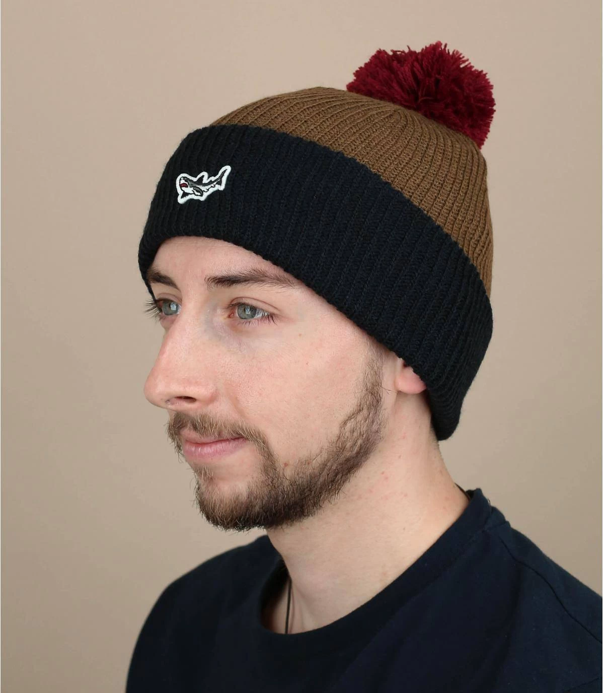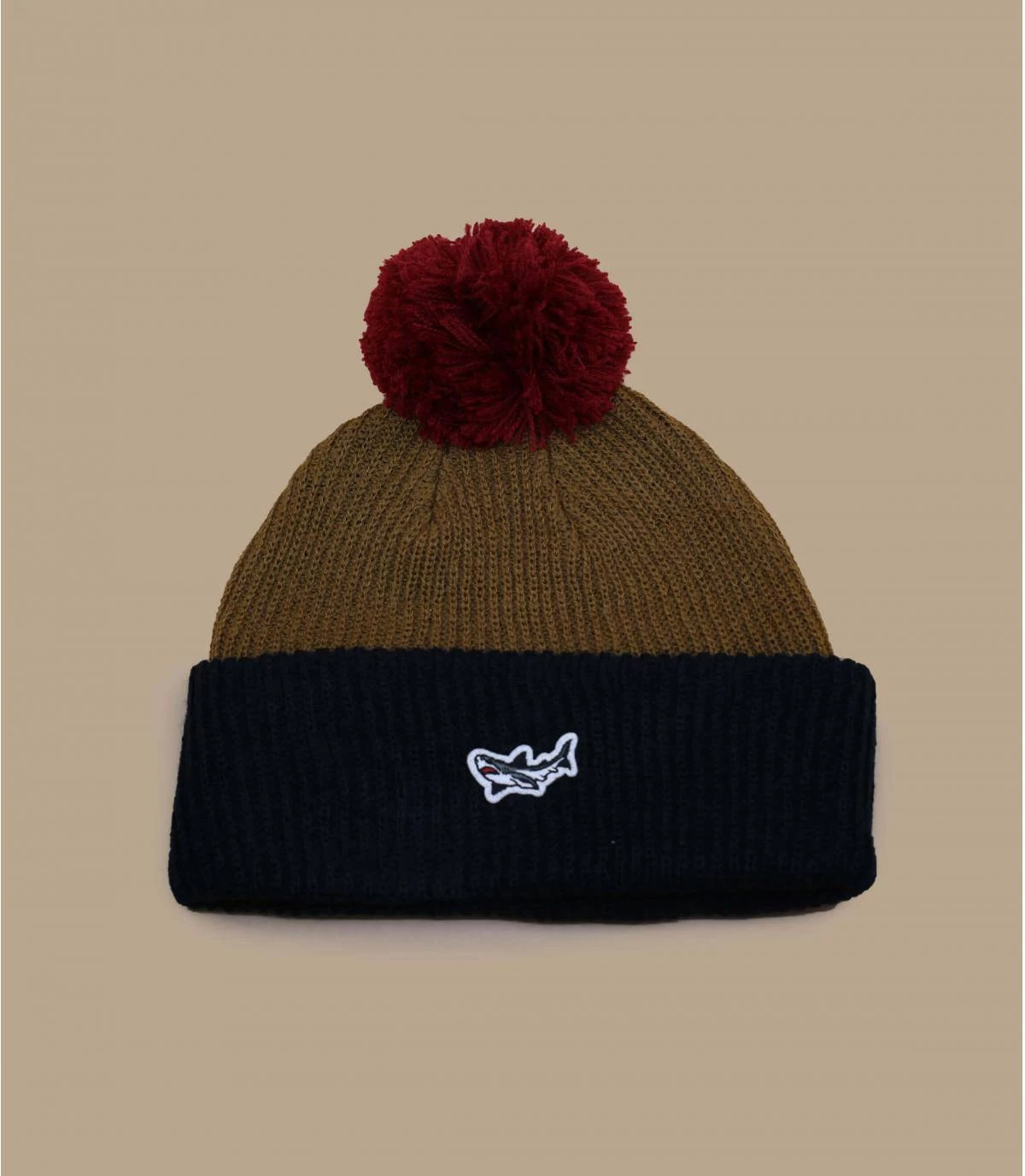 Trauen Sie sich, aufzufallen und farbenfroh zu sein, mit dieser tollen beige-blauen Mütze mit roter Bommel, die von der Marke Dark Seas angeboten wird. Das Modell ist mit einem gestickten Hai-Patch verziert.
