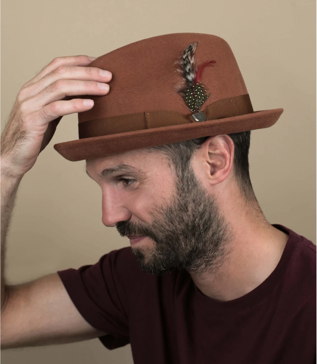 Wenn Sie einen Pork Pie-Hut aufsetzen, können Sie sicher sein, dass Sie Komplimente bekommen und nicht unbemerkt bleiben. Dieser Hut in Braun ist äußerst elegant. Mit einem weißen Hemd und einer Bundfaltenhose wirkt er sehr stilvoll.