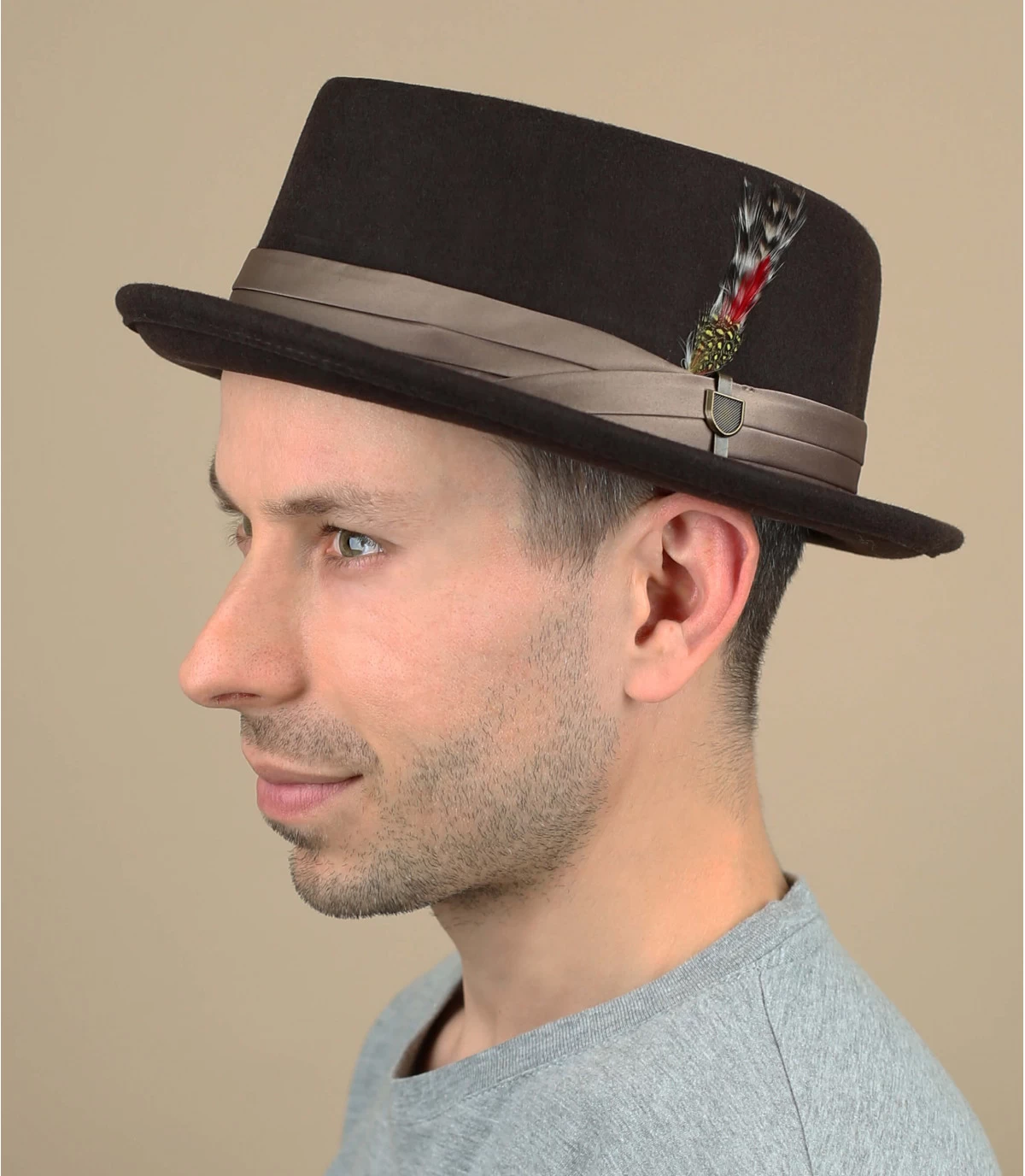 Der Pork Pie ist ein raffinierter Hut, der seinem Träger viel Eleganz verleiht. Dieses Modell aus Filz ist entlang der Kopfkrone mit einem Satinband, einer Metallnadel und einer Vogelfeder verziert.