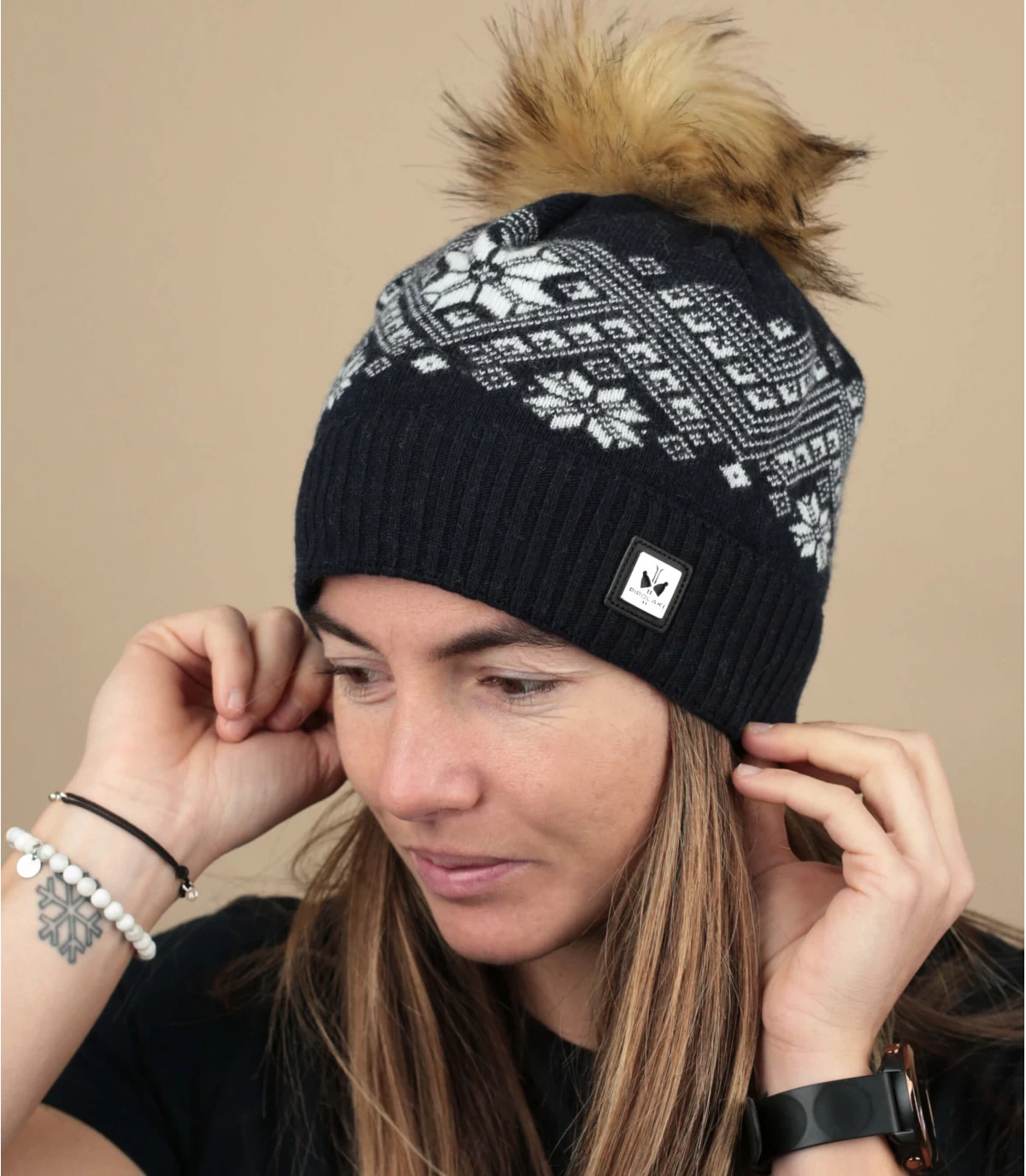 Eine Mütze, die gleichzeitig umweltfreundlich und elegant ist, ist eher selten! Diese marineblaue Bommelmütze für Damen wurde in Italien aus recycelten Materialien hergestellt. Sie trägt ein einladendes Muster, das an Abende vor dem Kamin erinnert.
