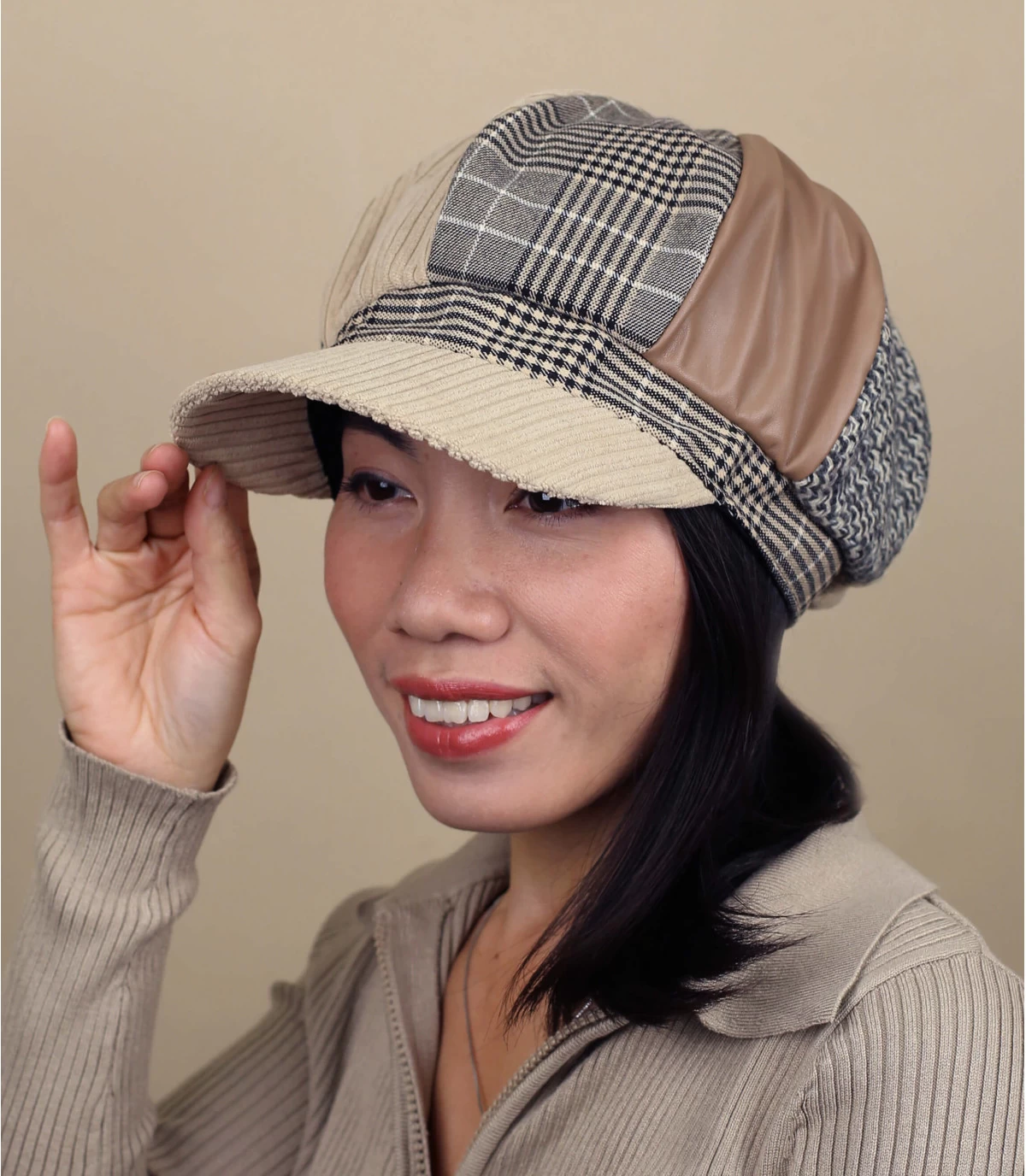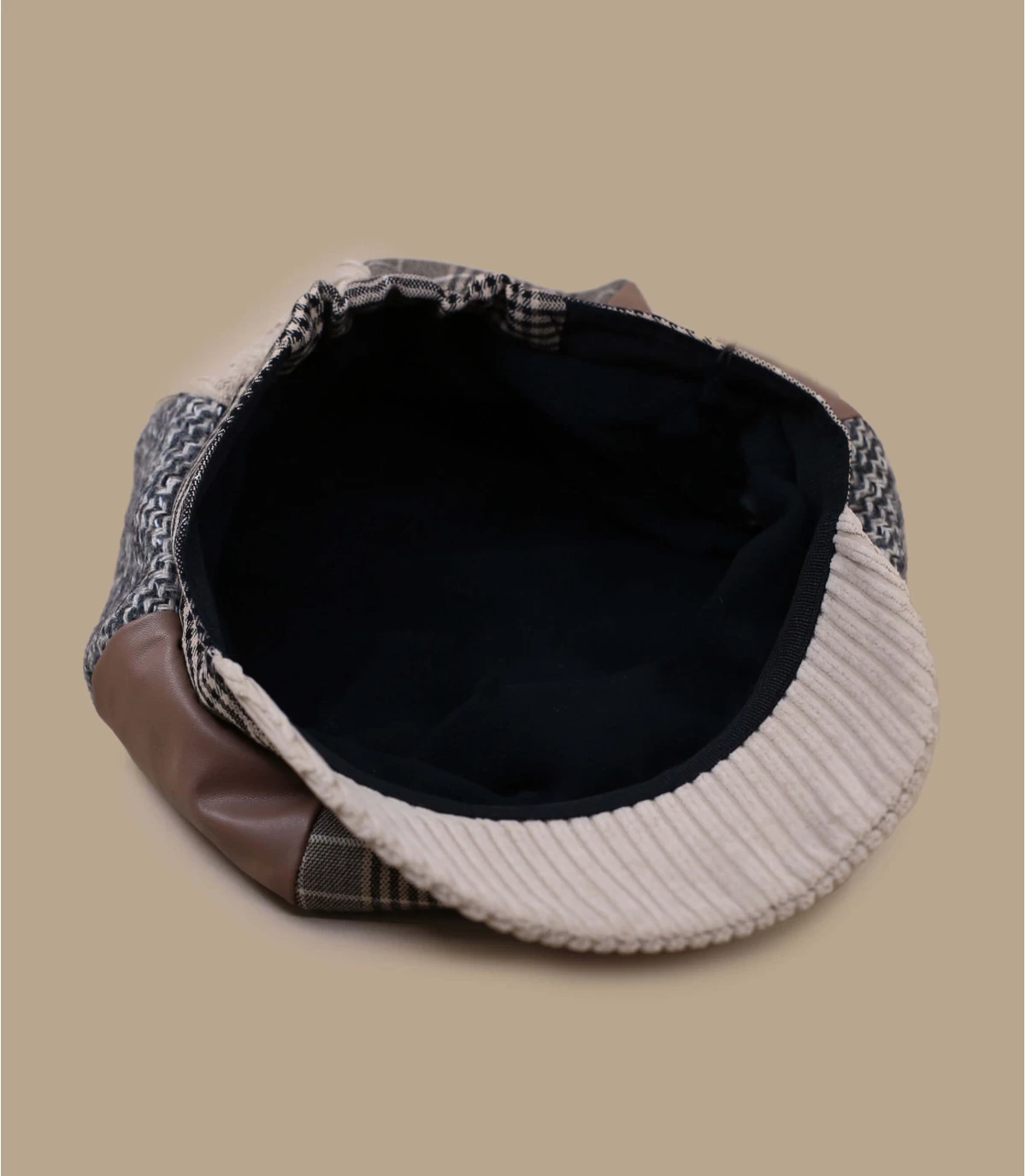 Entscheiden Sie sich für diese schöne Ballonmütze für Damen im anspruchsvollen Boho-Look. Sie wurde in Italien hergestellt und hat ein beige-graues Patchworkmuster mit Einsätzen aus Stoff und Samt, wie z. B. auf dem Schirm.