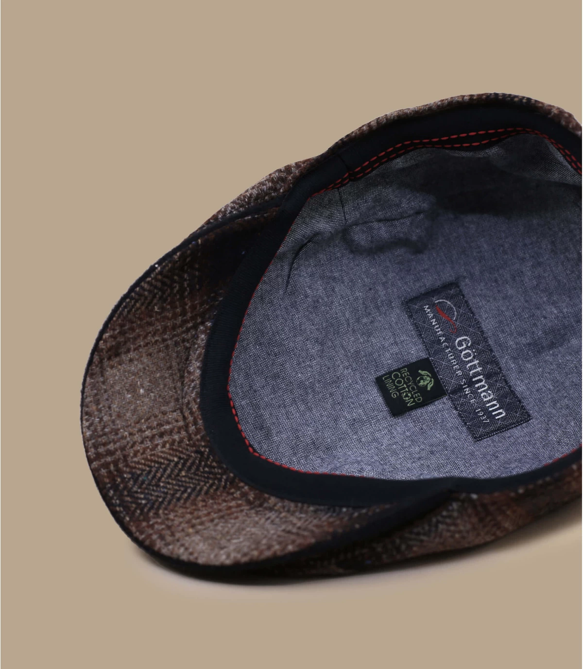 Diese warme und bequeme braune Schiebermütze aus Schurwolle steht für Eleganz und wird Ihr Aussehen verändern. Sie hat ein Karomuster mit braunem und schwarzem Garn und ist ideal für den Herbst.