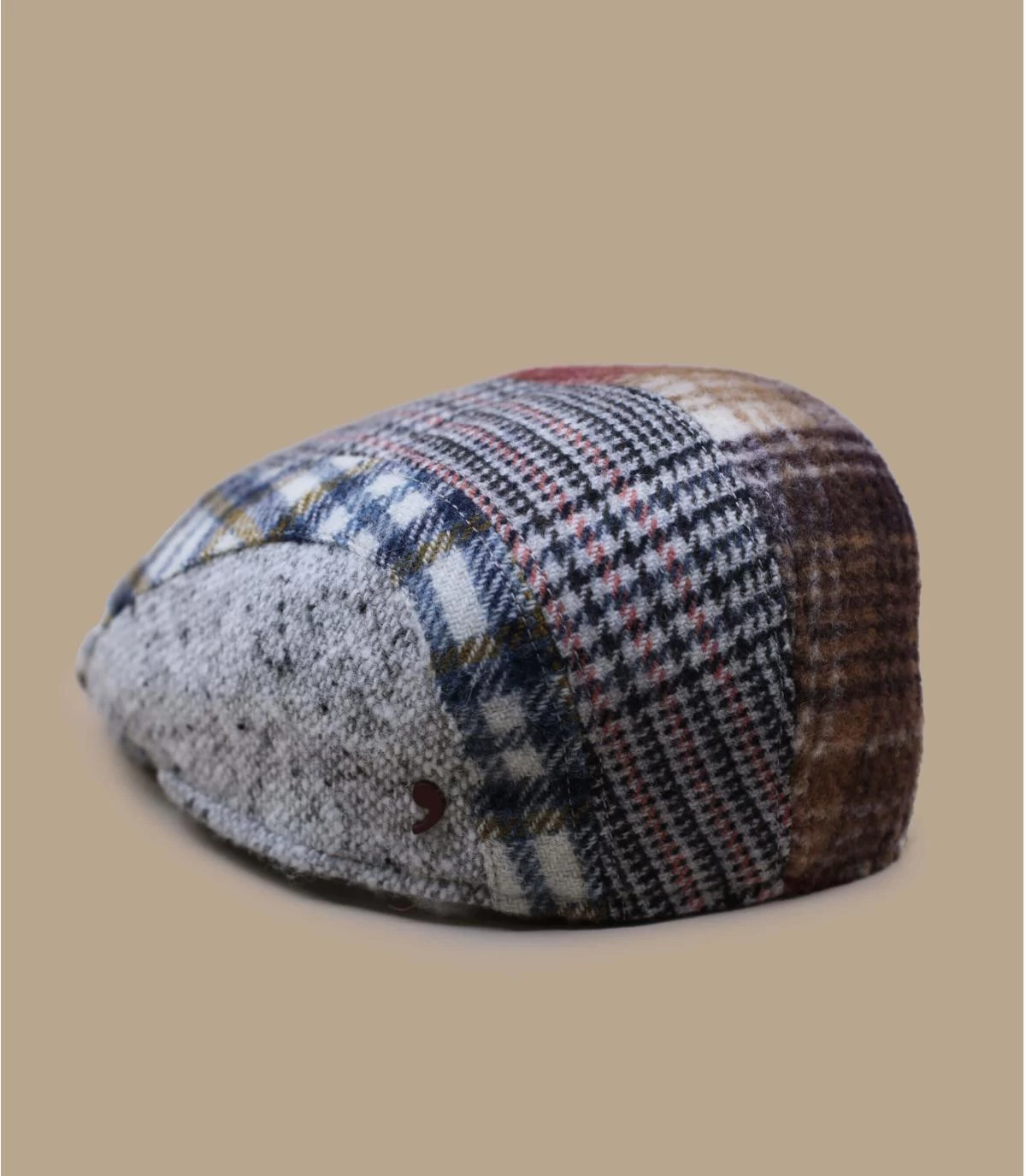 Verschiedene Stilrichtungen in einer einzigen Flatcap! Diese bunte Schiebermütze ist aus einer Mischung verschiedener Wollarten gefertigt. Sie ist sehr raffiniert mit ihrem Patchwork aus weißen, roten und blauen Farbstreifen mit einem Karomuster.