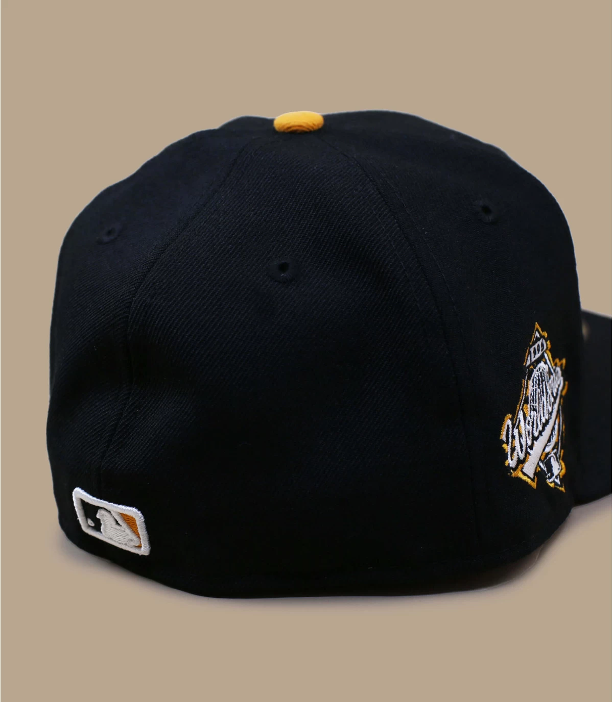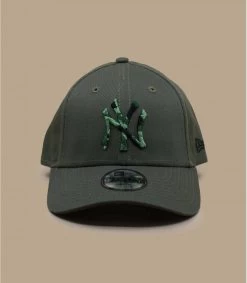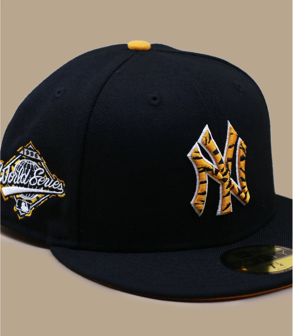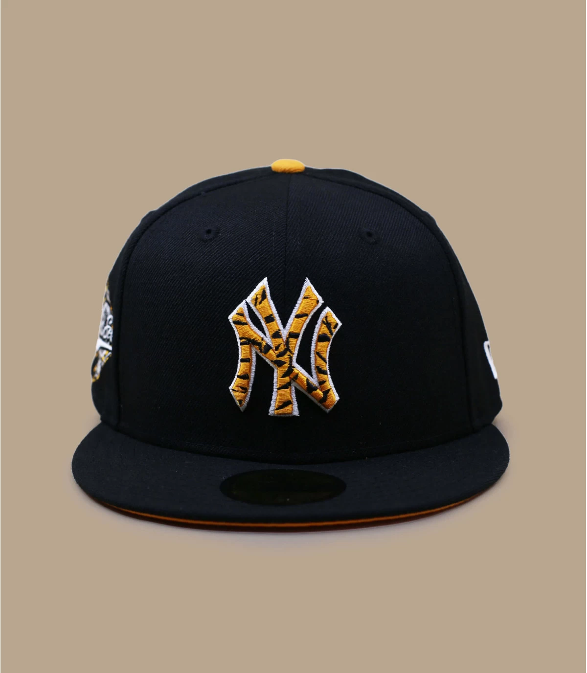 Diese schwarze Cap verbirgt ihr wahres Aussehen. Sie trägt die Initialen New York auf der Vorderseite mit einem originellen orangefarbenen Tiger-Effekt. Die Unterseite des Schirmes ist ebenfalls orange. An der Seite sind das New Era-Logo und die Flagge zu sehen.