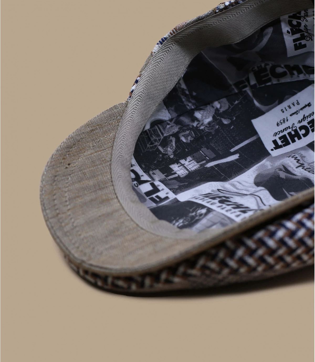 Sie werden nicht unbemerkt bleiben, wenn Sie diese in Frankreich hergestellte Schiebermütze aus 100% Leinen mit ihrem originellen Stil tragen. Sie hat ein Patchwork aus verschiedenen Prints in Beige, grauen Karos und einem blau-weißen Maschenmuster, das ihr einen dynamischen Look verleiht.