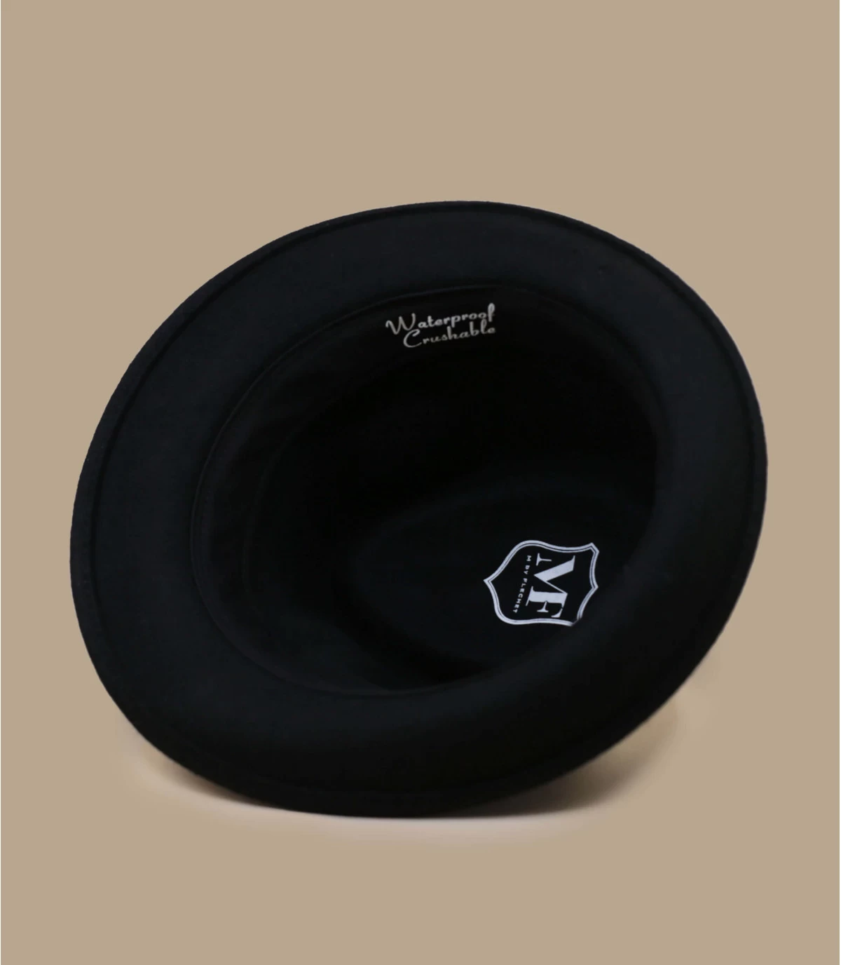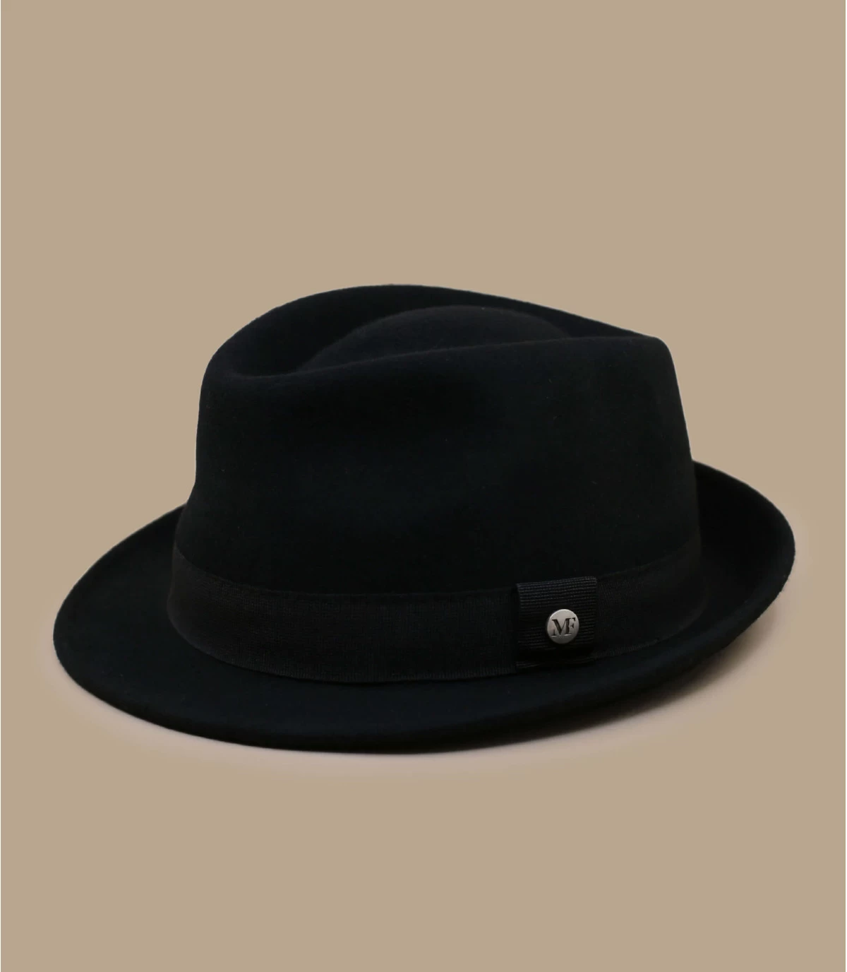 Verwöhnen Sie sich mit dem Komfort eines in Italia hergestellten Hutes, mit diesem wunderschönen flexiblen schwarzen Trilby aus Wollfilz. Sein wasserabweisendes Material ist wetterfest und wird durch ein schönes Hutband und einen Metall Pins hervorgehoben.
