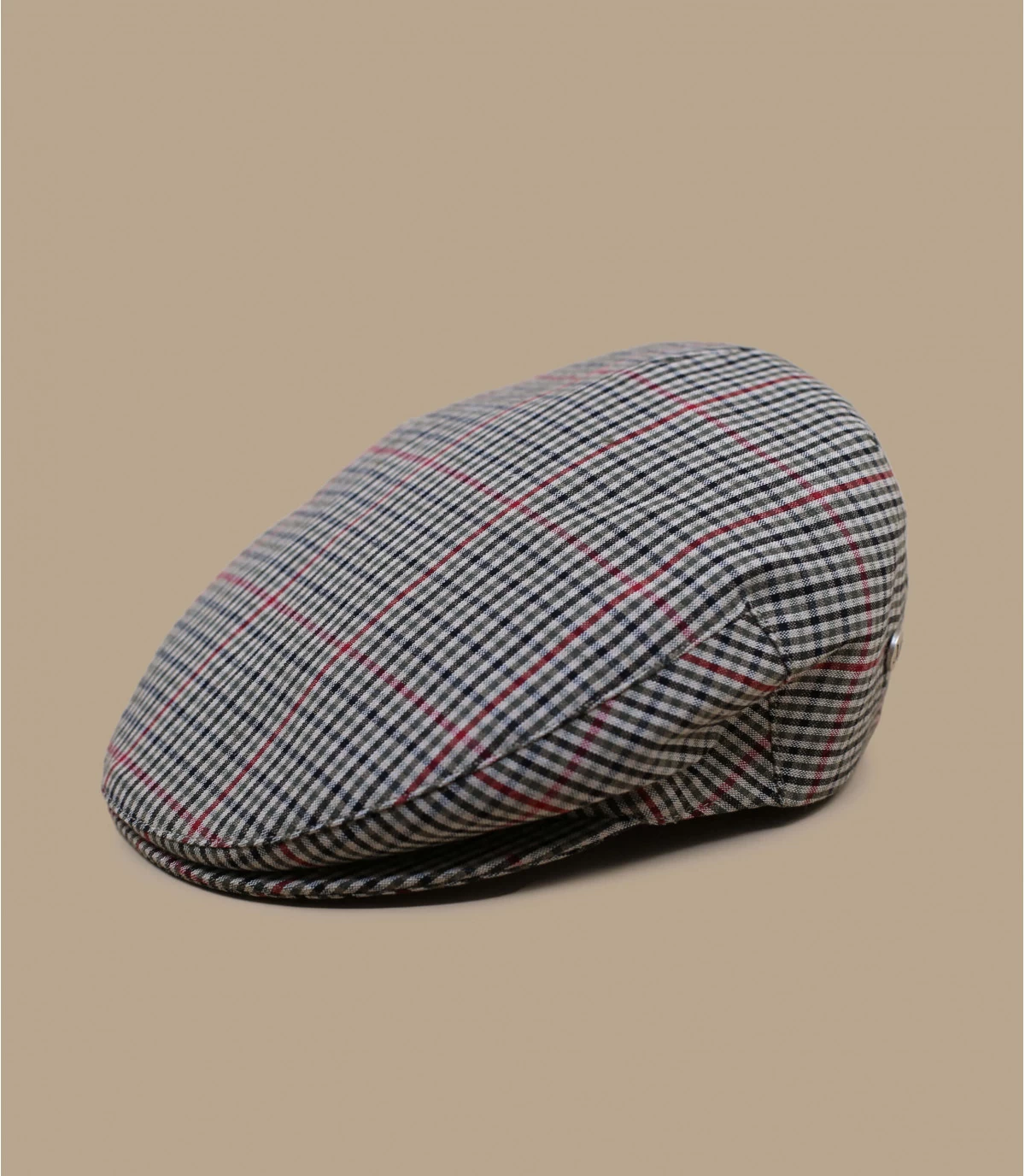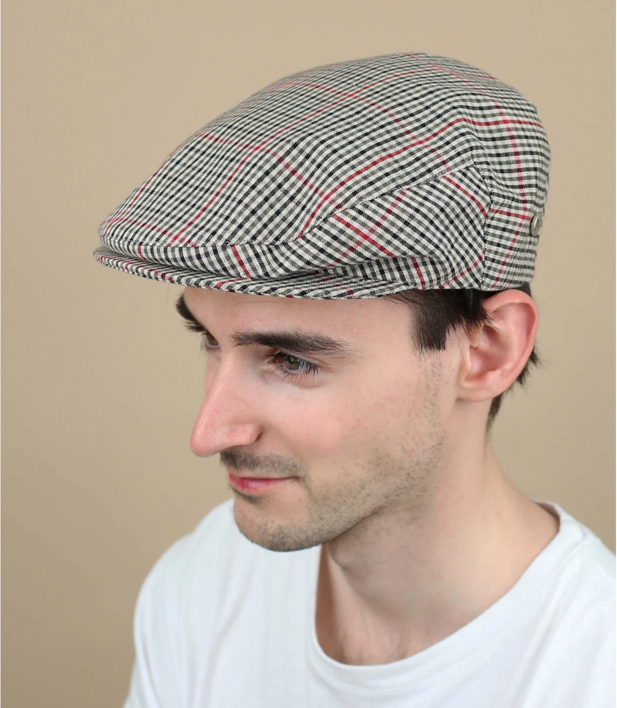 Diese beigefarbene Schiebermütze ist ideal für den Sommer und wird Ihnen wie angegossen stehen! Sie hat ein gleichmäßiges, leichtes Karomuster. Es wurde in Italien aus Baumwolle hergestellt und ist zertifiziert nachhaltig und frei von Chemikalien.